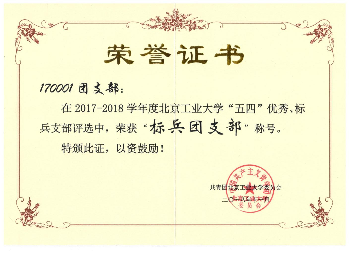 170001团支部 荣获 五四优秀标兵支部 优秀团支部