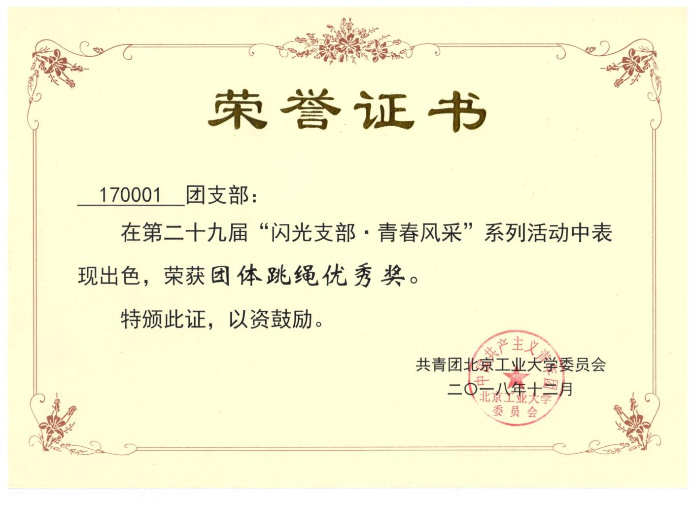 170001团支部 荣获 闪光支部 青春风采 团体跳绳优秀奖