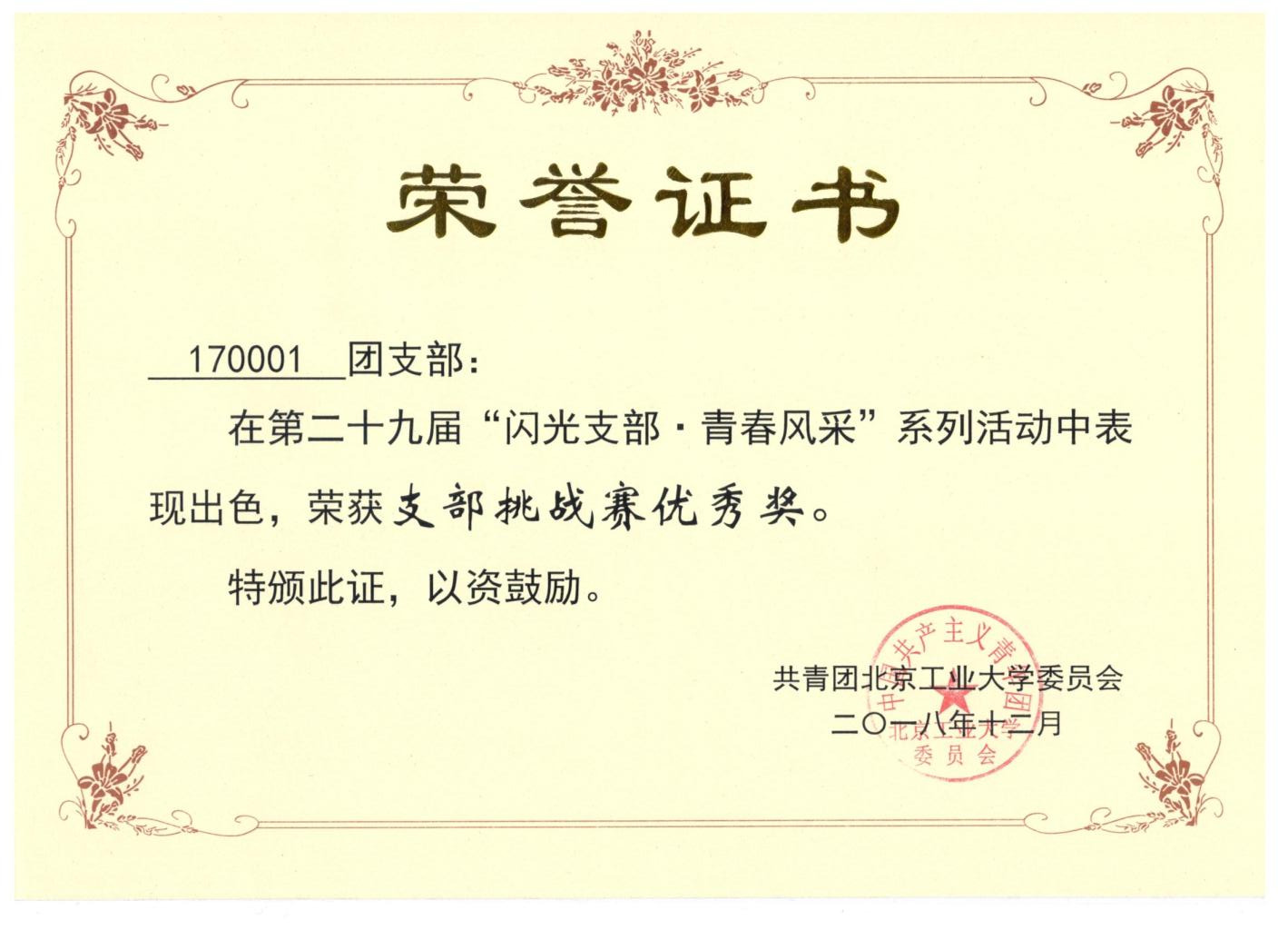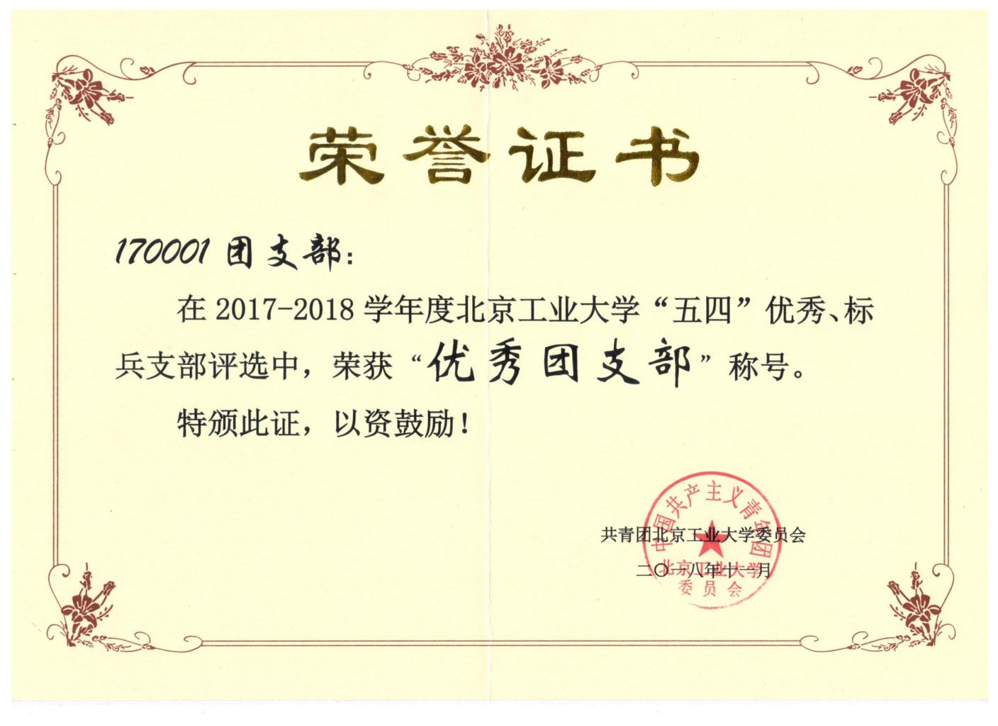 170001团支部 荣获 优秀团支部