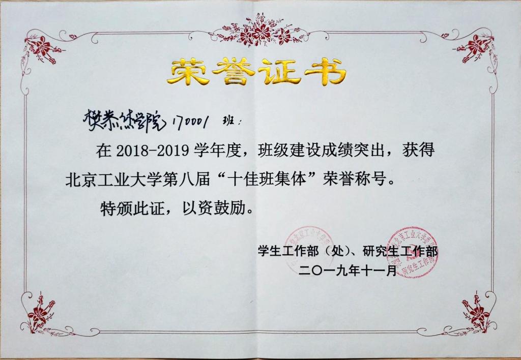 170001班 荣获 十佳班集体