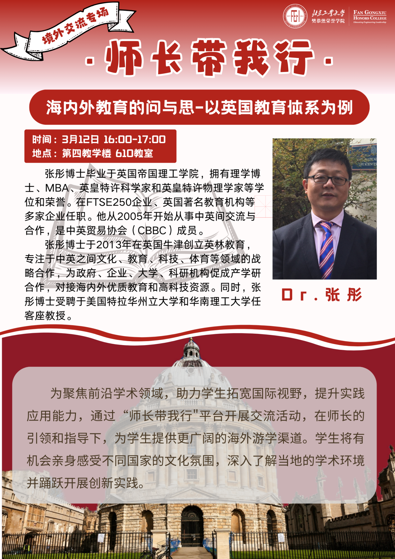 张彤老师指出,此次研修活动的主要地点将覆盖英国的“教育黄金三角”区域,包括牛津、剑桥两所知名高校。