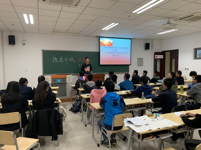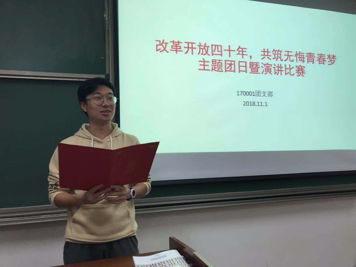 10月31日晚与11月1日晚,180001支部和170001支部分别于第四教学楼607、610教室举行了主题为“改革开放四十载,共筑无悔青春梦”主题团日暨演讲比赛。支部同学们纷纷积极参与,多名同学细心准备了精彩的演讲。