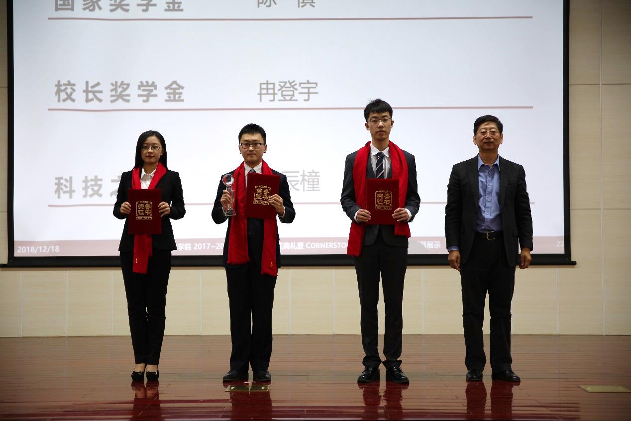 最后,副校长吴斌教授为获得2017-2018学年国家奖学金的陈慎、校长奖学金项目团队负责人冉登宇、校科技之星的相辰橦颁发荣誉证书。