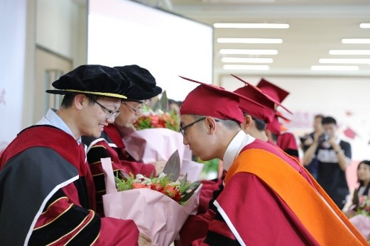 毕业生为导师代表,任课教师和人才培养工作老师献花表达感恩之情。