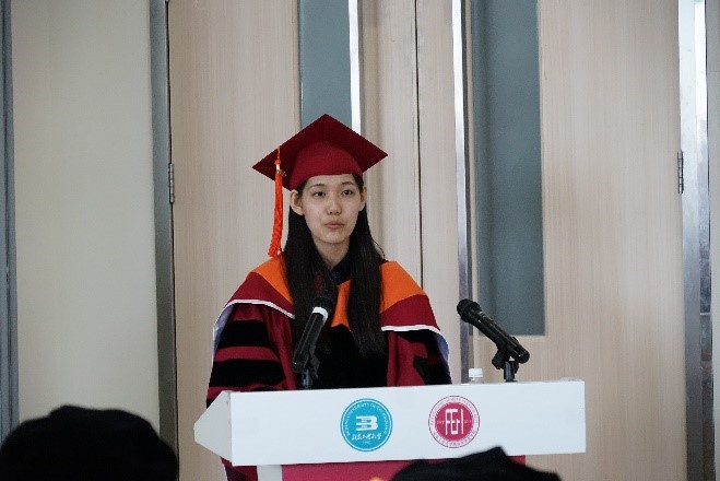 冉登宇、王煜同学分别代表毕业生做了中英文的发言。冉登宇同学回顾了樊院大学四年的学习和生活,鼓励大家要不畏困难,坚持创新,牢记“在樊院一切皆有可能”,毕业后继续为樊院建设作出贡献。王煜同学全程英文发言,她总结到,在樊院四年学到的不仅是科学知识,更多的是“be professional”的处事态度和“No matter what job we’re gonna do, we always want to show our concern about technical problems and ethical issues”的科研态度。