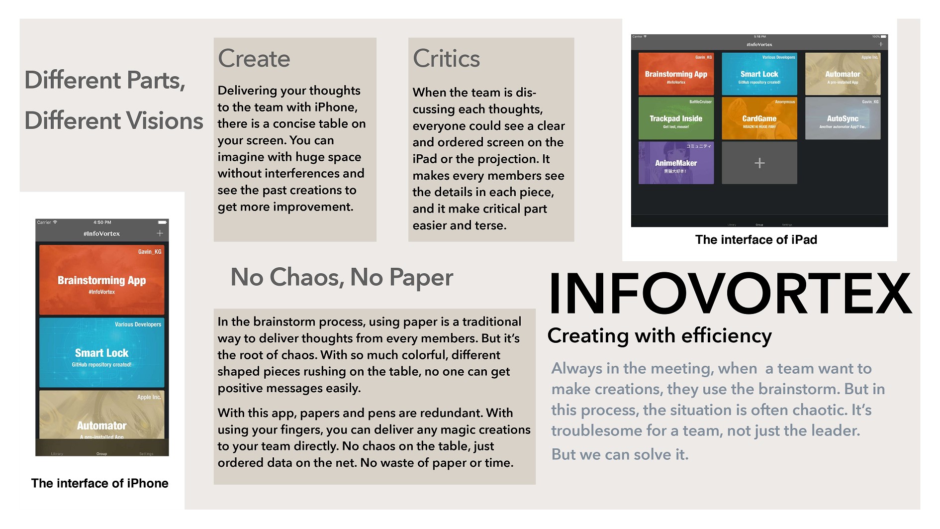 本次大赛从今年6月开始,历经初赛、复赛及决赛三个阶段,樊恭烋学院的高锴庚、邓华龙同学从361支参赛队伍中脱颖而出,进入最后参加决赛的30支队伍。他们所开发的InfoVortex软件是一个日常使用的效率型软件,致力于帮助人们更好的进行头脑风暴及创新思考,并将创新思想传播到每个人,增强全民的创新能力。经过软件介绍演示、专家评审等环节,最终获得了2016 年中国高校计算机大赛——移动应用创新赛决赛二等奖和专项奖“用户体验奖”。
