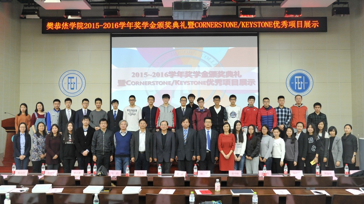 典礼上,樊恭烋学院2015-2016学年Cornerstone、Keystone课程老师对Cornerstone、Keystone项目结题汇报所评选出的优秀项目进行了颁奖。获得结题优秀的2个项目“生态敏感区桥面径流收集处理装置的研制”、“智能自行车锁”分别代表Cornerstone、Keystone项目进行了汇报和成果展示。在樊恭烋奖学金颁奖环节,出席的领导和任课老师们依次为获得樊恭烋学院2015-2016学年院级、校级、国家级以及樊恭烋奖学金的个人与集体颁发了获奖证书。获得“樊恭烋奖学金”的邵嘉琳同学代表获奖同学发表了获奖感言。