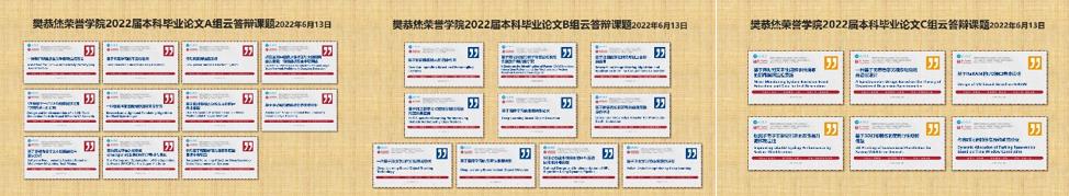 尽管疫情反复无常,打乱了同学们线下的学习、生活和工作,但学院为了保证2022届本科毕业设计工作如期完成,确保防控期间同学们能够顺利毕业,根据实际情况及时制定了线上答辩的工作方案,同时面向全体毕业生调研毕业设计工作中可预期困难,最终本次答辩共分为A、B、C三组,以腾讯会议的形式分别开展。其中A、B两组是计算机专业组,C组是综合专业组。每名毕业生有15分钟的展示环节以及5分钟的答辩环节。汇报人对项目已开展的工作、创新点、取得的成果和未来工作展望等多个方面进行了介绍,每一位汇报人向评委组提交了论文和poster供审阅,评委老师们在答辩环节中为同学们提出了很多非常有价值的建议,同时也收获了新鲜的想法和视角。