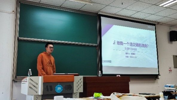 李亚欧学长首先列举了一些对交通专业比较片面的刻板印象,并且对其中一些关键词做了相应的解释。随后,学长将讲述重点放在了“个人感受”和“交通相关”两个关键词上。学长高屋建瓴地从交通运输工程这个整体的专业到交通设备与控制工程等更细节的分类,介绍了交通专业毕业生今后就业和深造的方向。最后,学长强调了在以后的学习中,实践对于交通专业学生的重要性,并且就自己在交通专业学习过程中的一些感触给同学们提供了建议,为以后有志于此的同学们提供了宝贵的经验和努力的方向。