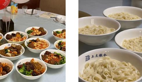 什么样的生日体验能好过亲自做一碗长寿面呢?正午时分,在大厨的指导下,适逢春日初度的樊院学子们围在案板旁,从揉面、擀面到切面,面杖横飞、手起刀落,每个人都参与了长寿面的制作,既体会了下厨的艰辛,又品尝到了“自己动手、丰衣足食”的甜蜜,可谓是一次颇具深意的生日会。在我国古代,脸即面,“脸长即面长”,故人们常常借用长长的面条来祝福长寿;而此刻,同学们碗中亲自制作的面条却如同青春的星线,连接着过去的思忆与前路的明星;只见岁月沉香与未来憧憬一同沁润进亲手制作的面条中,随面汤的水汽慢慢氤氲开来,深吸一口、细细咀嚼,味道一如少年时。