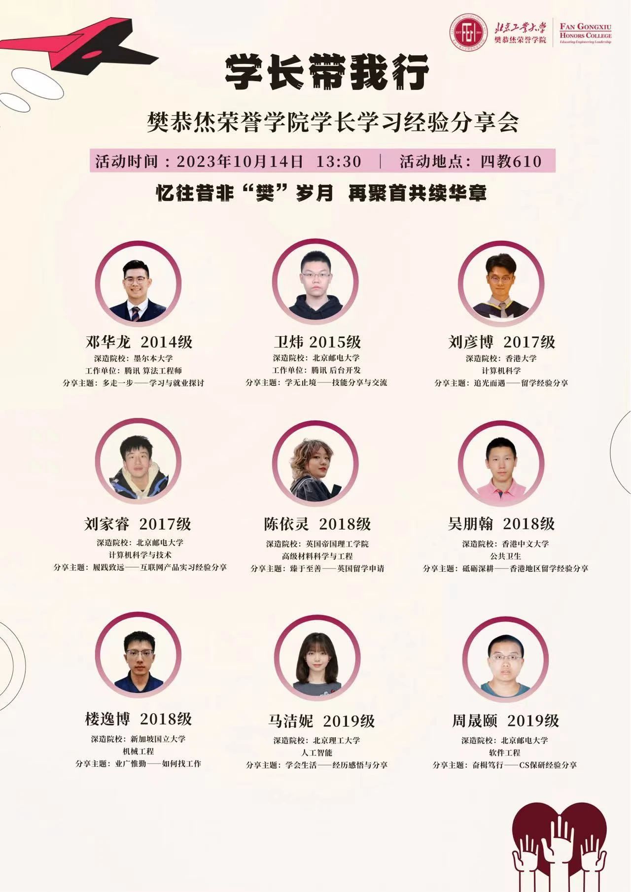 各位校友们介绍各自的精彩故事,与各位同学们进行互动和讨论,共享自己学习生活中的宝贵经验。