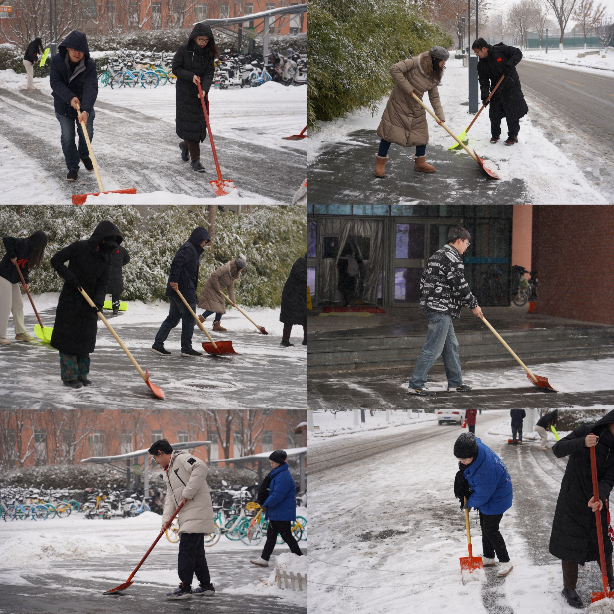 全体教职工和学生志愿者在第四教学楼门前集合,共同参与了积雪清扫活动。在飘洒的雪花中,大家挥舞着扫雪铲冰的工具,合力为四教学楼门前的道路扫出了一条安全通道,为来第四教学楼学习的师生提供便利。尽管天气寒冷,但每个人都干劲十足,共同努力将积雪清理干净。