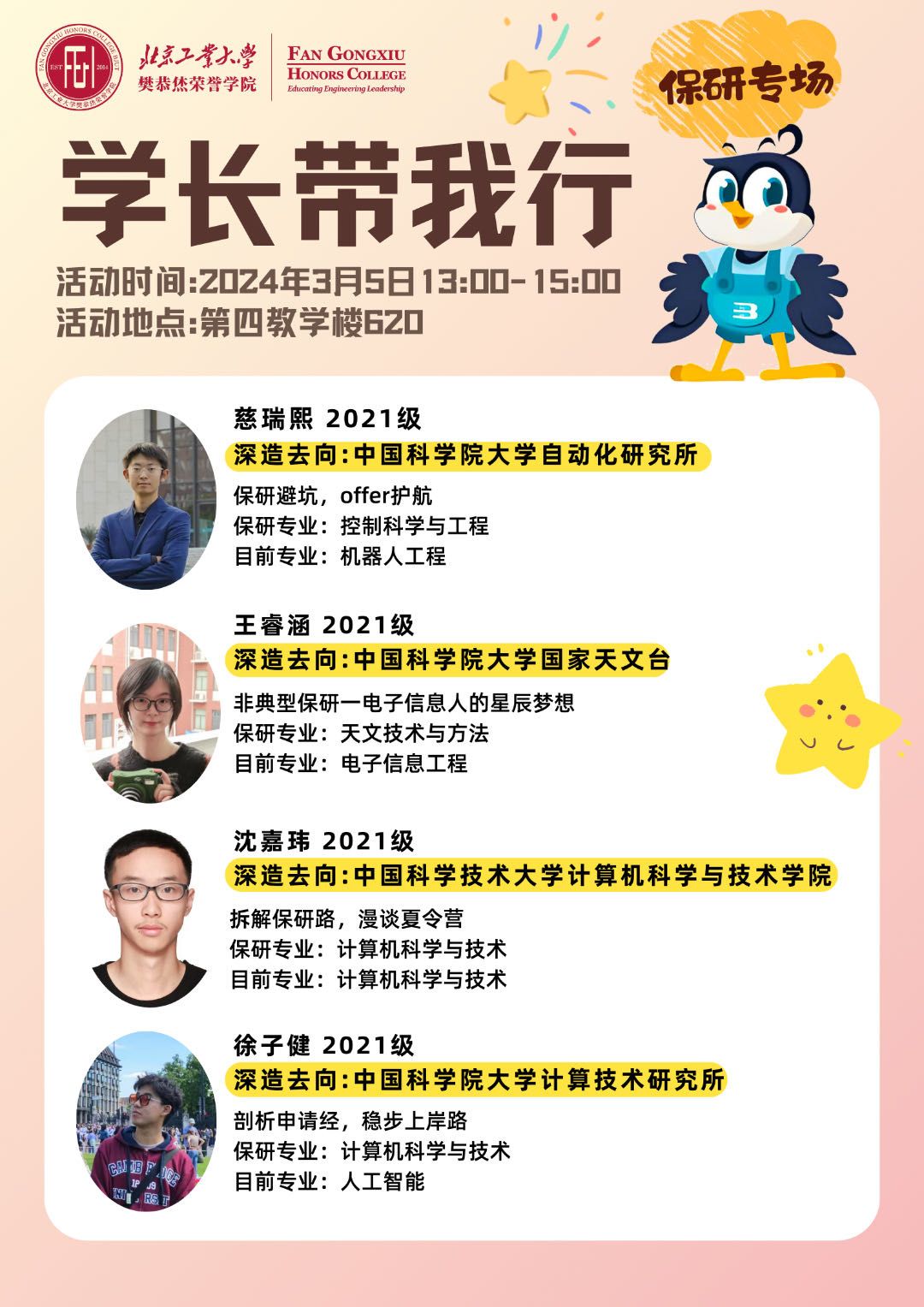 于3月起举办“学长带我行”、“师长带我行”系列活动,通过邀请师长、高年级本科生进行经验交流分享,为低年级学子提供专业指导和答疑解惑,旨在延续樊院学子一贯的责任意识与传承精神,助力同学们更高效地进行学业规划和未来发展。本次“学长带我行”系列活动面向全体同学开展了问卷征集,针对同学们关心的夏令营信息、面试材料准备、考试技巧、跨专业深造以及直博申请等内容,于2025年3月5日举办了第一期经验交流会。交流会邀请了慈瑞熙、沈嘉玮、王睿涵、徐子健四位同学作为分享嘉宾,会议由辅导员戴璐老师主持。