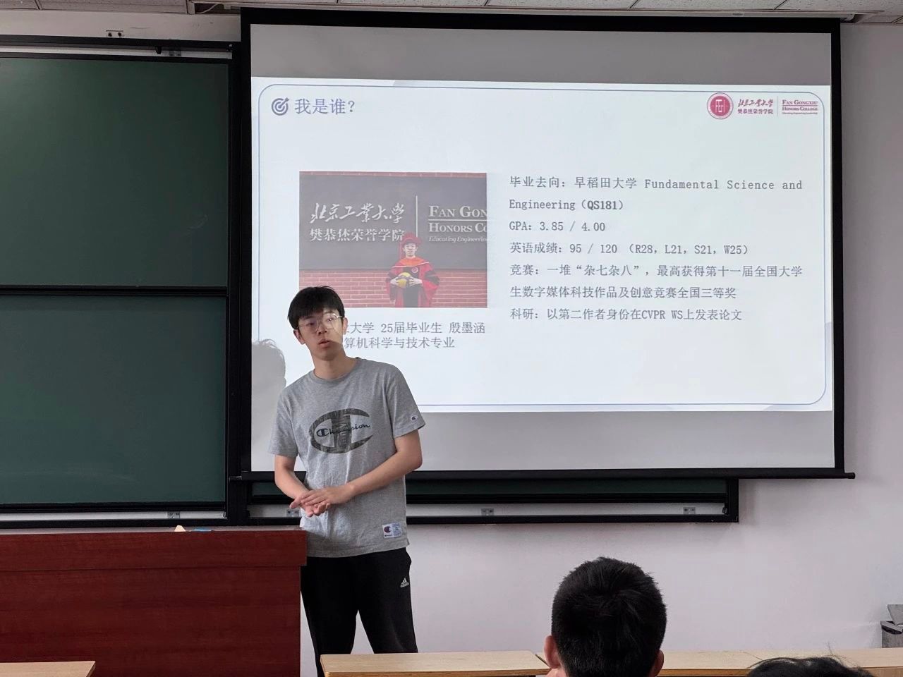 殷墨涵学长结合自己的经历,回顾了自己在科研探索中的曲折与收获,并着重讲解了如何申请国外学校,拿到目标院校的offer。从最初的迷茫到逐步明确方向,他用真实经历告诉学弟学妹们:成长是一场自我探索的旅程,要在尝试中不断寻找适合自己的路。他鼓励大家敢于迈出第一步,在过程中积累、沉淀。