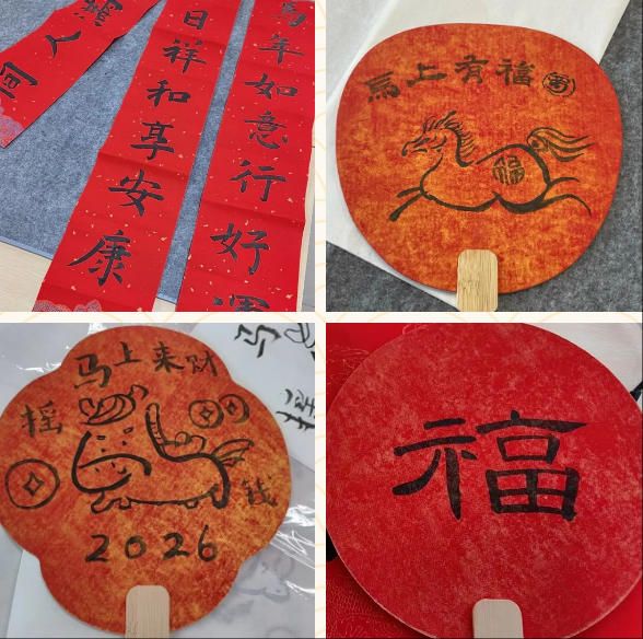 第一次在樊院过年,参加国学书法体验活动的经历实在太难忘了!学院为我们准备了红纸、书签、扇面等多种材料,在老师耐心指导下,我重新提起久违的毛笔,一笔一画间,渐渐找回了书写的感觉。我一口气写了好几张作品,每一幅都可以带回去留念——其中最满意的一幅,已经贴在了寝室门上!