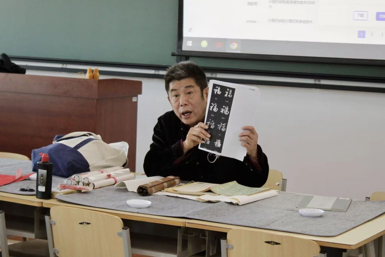 活动的开始,范教授为同学们细致解读中国书法一脉相承的文化精髓。他结合竹简、碑帖的珍贵资料,娓娓道来书法艺术从先秦篆书、秦汉隶书,到楷书、行书、草书的流变脉络与审美意趣,深刻阐释了 “书画同源” 的内涵,点明书法的线条亦是富有生命力的艺术表达。随后,范教授对比中西方构图审美之差异,结合民间福字的创作要义,细致剖析中式美学里疏密有致、气韵贯通的独特章法。深入浅出的讲解,让同学们深切体悟到中华文化沁润人心的独特魅力,感受根植于民族血脉的文化脉搏。