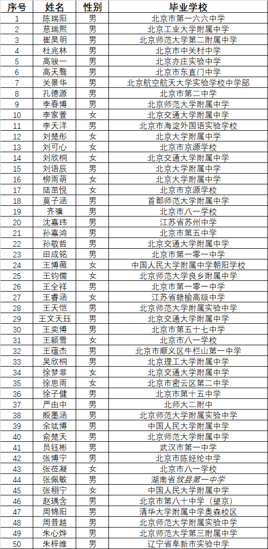 新生选拔工作的安排,经学生自主申报、材料初审、线上复试各环节专家组评审、终审专家组审定,最终确认以下50名同学进入四虎影院
